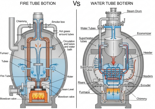 Puede que le confundan los diferentes principios operativos de las calderas industriales. Si los mezcla, la eficiencia de su planta cae inmediatamente. Aquí tiene el desglose claro de cómo funcionan. La principal diferencia radica en dónde interactúan el agua y el calor. En las calderas pirotubulares (tubos de humo), los gases calientes pasan por tubos rodeados de agua. En las calderas acuotubulares (tubos de agua), el agua fluye dentro de los tubos mientras los gases calientes los rodean. Los diseños acuotubulares generalmente manejan presiones y temperaturas más altas que los diseños pirotubulares.
