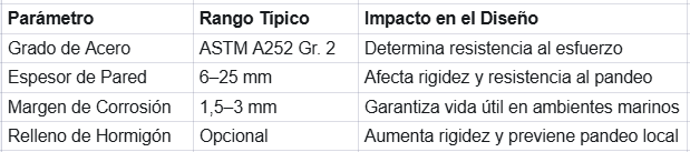 El proceso de diseño implica determinar dimensiones geométricas, grado de acero y capacidad de carga para cumplir con los requisitos estructurales y geotécnicos.