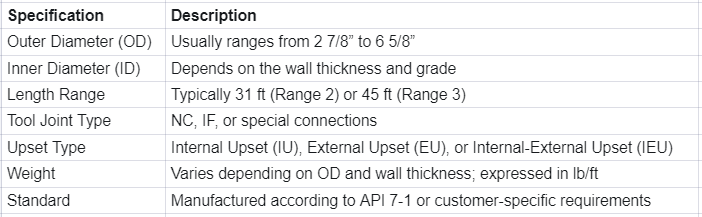 The specifications of a heavy weight drill pipe are defined primarily by API Specification 7-1, which sets the global industry standard. Key parameters include: